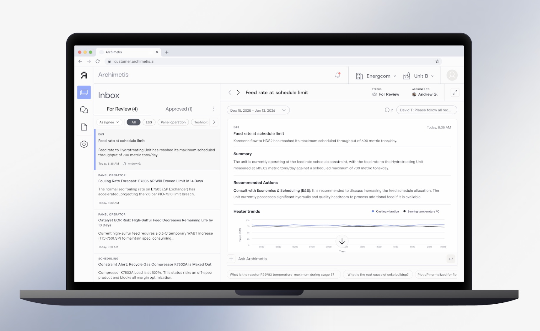 Archimetis’s operational reasoning system bridges this gap by deploying a modern AI stack that integrates leading language models and analytics tools in a secure, private cloud environment. The system regularly monitors operations for issues and opportunities, combines structured and unstructured data from multiple sources, applies global and company-specific best practices, and performs the kind of complex engineering analysis that previously required days of manual work.