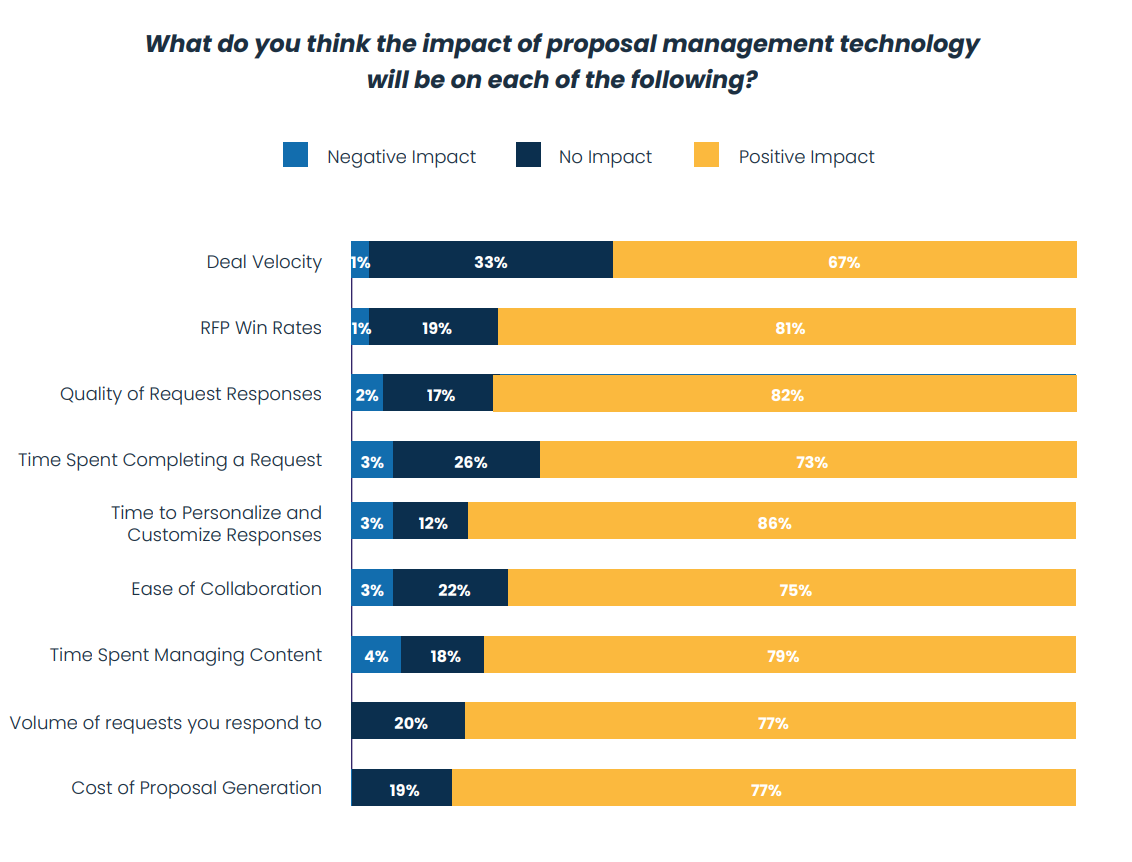 Expectations for proposal AI and automation are sky-high. 81% of respondents expect proposal management software to lead to higher RFP win rates, while 73% expect to complete requests faster, 67% anticipate faster deal velocity, and 77% expect lower proposal generation costs. In terms of process, 86% expect AI to improve the time required to personalize and customer RFP responses, while 82% anticipate improvements in response quality and 79% expect reduced time spent managing content.
