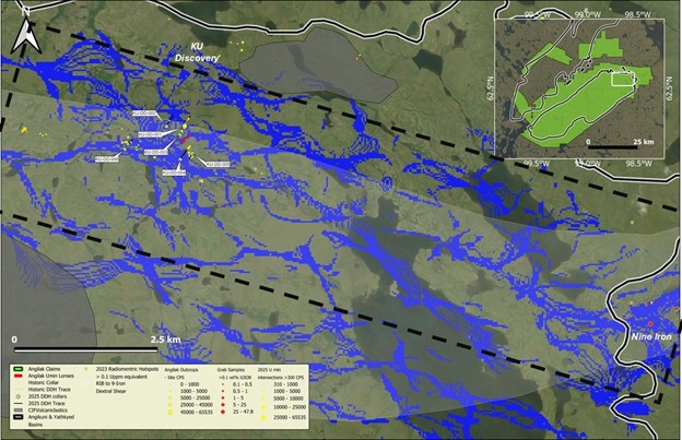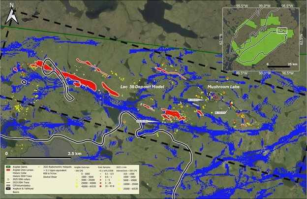 Cliff Revering, VP Exploration added: “The 2025 Angilak exploration program was designed with two core objectives: expanding the mineralization footprint at the Lac 50 deposit and advancing two high-priority regional targets – KU and RIB – located along the RIB-Nine Iron Trend. The program not only met these objectives but also exceeded expectations, yielding multiple new discoveries at both KU and RIB. A key highlight was the identification of a 12 km-long structural corridor associated with uranium mineralization, anchored by the significant new discovery at RIB North.