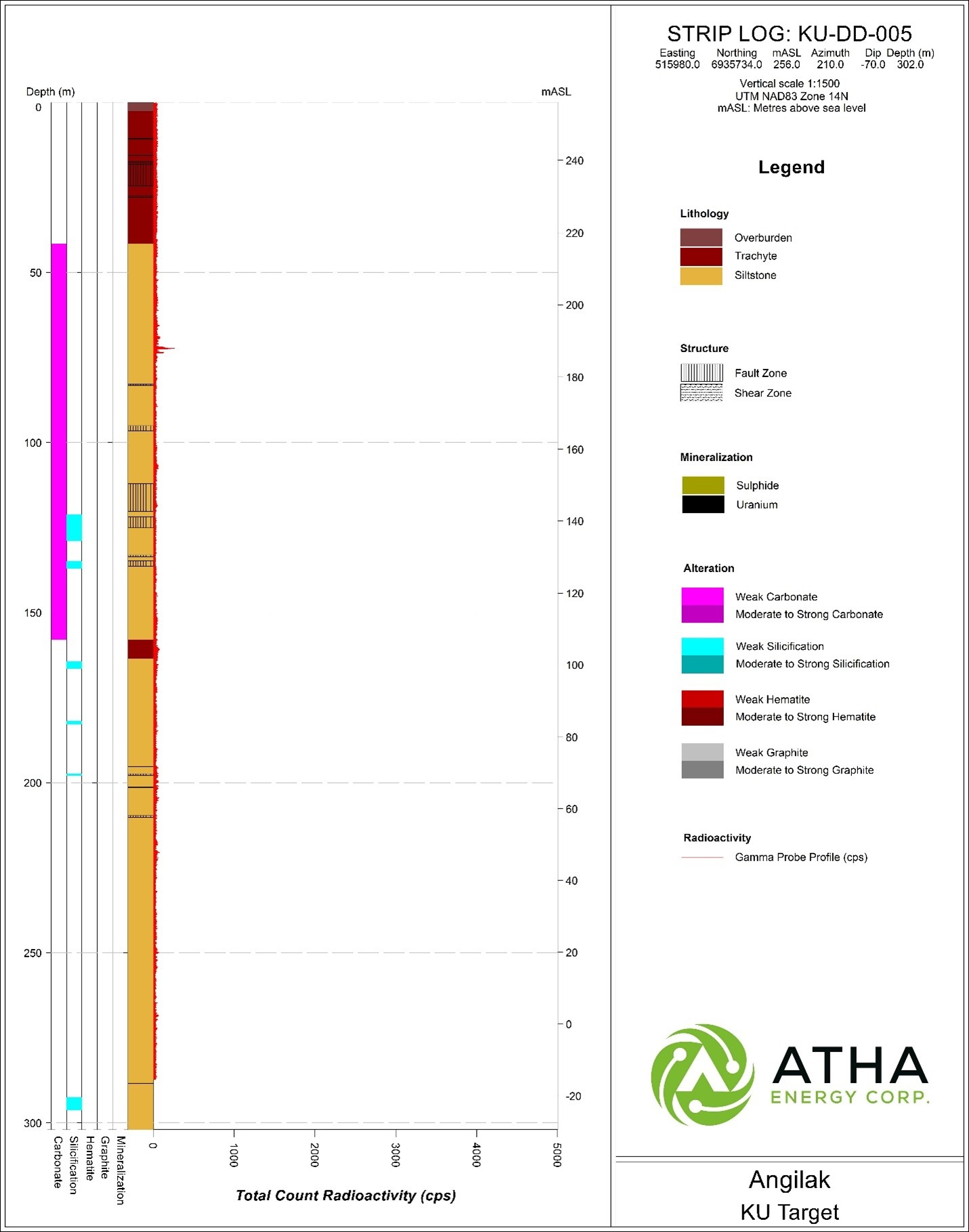 Figure 8: Striplog KU-DD-005 showing radioactivity based on 40TGU-1000 Triple Gamma Down Hole Probe 1 & 2 .