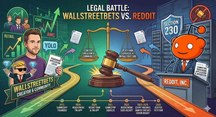The founder of the wildly influential WallStreetBets community, which helped fuel the GameStop and AMC stock market saga, has petitioned the Court to determine whether tech platforms can ban creators and then claim ownership of their brands.