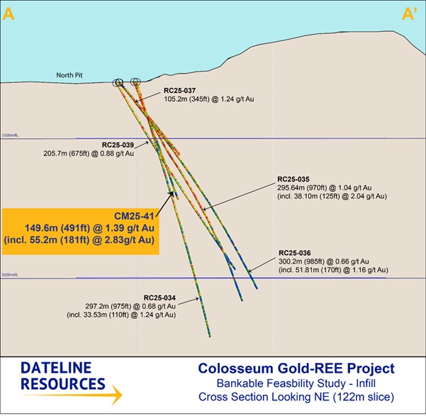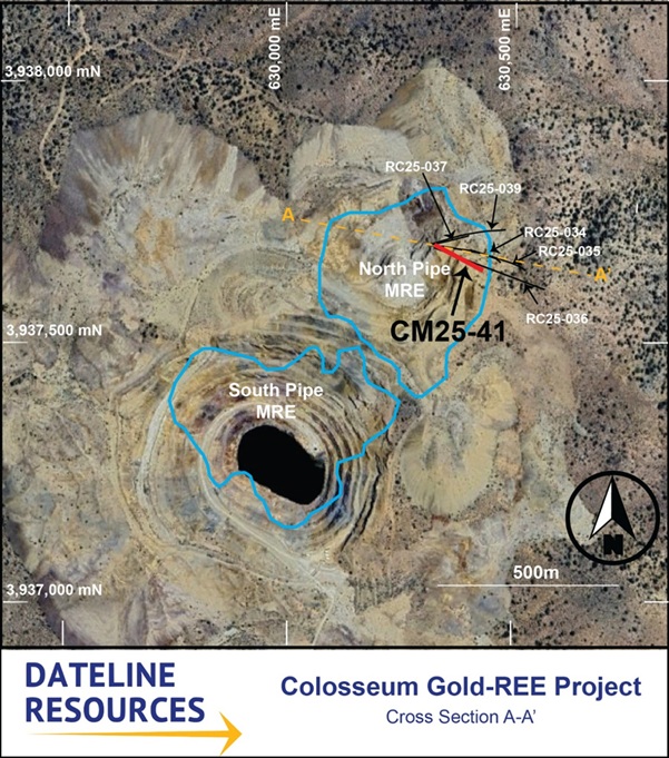 SAN BERNARDINO, CA / ACCESS Newswire / February 12, 2026 / Dateline Resources Limited (ASX:DTR)(OTCQB:DTREF)(FSE:YE1) (Dateline or the Company) is pleased to report results from diamond core hole CM25-41 at its 100%-owned Colosseum Gold and Rare Earth Element (REE) Project in San Bernardino County, California. The hole was drilled in the northeast extension of the North Pipe breccia system, an area beyond the currently defined mineral resource boundary that has been progressively delineated through the Company’s 2025 drilling program.