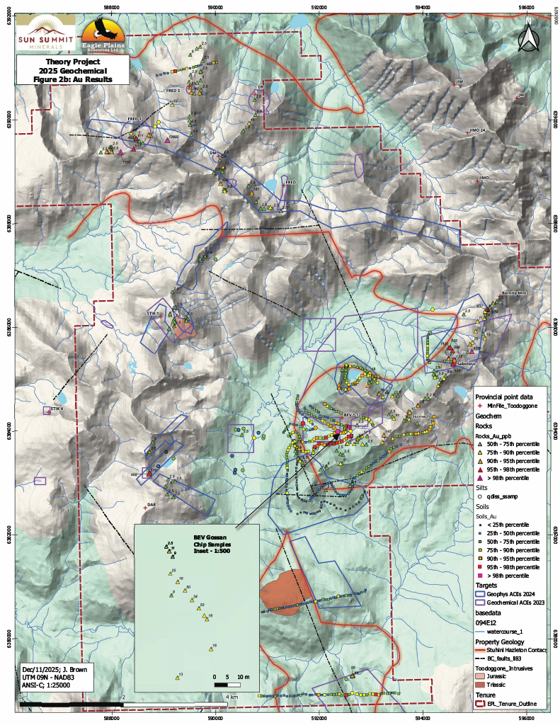 Chuck Downie, P.Geo., President and CEO of Eagle Plains, commented, “We are very excited by the results from the first fieldwork at the Theory Project in over thirty years, which underscores the unexplored nature and exceptional geology of the property. Ground truthing of anomalies generated through airborne geophysical and remote sensing surveys directly resulted in the Saboteur discovery, a multi kilometer scale zone of copper mineralization. Advanced petrographic analyses, combined with field mapping of extensive hydrothermal alteration zones and copper-gold-silver geochemical anomalies indicates the presence of a proximal buried porphyry system. We eagerly look forward to the 2026 field program, and working with Niel and Ken and the Sun Summit team to advance the property to drill testing.”