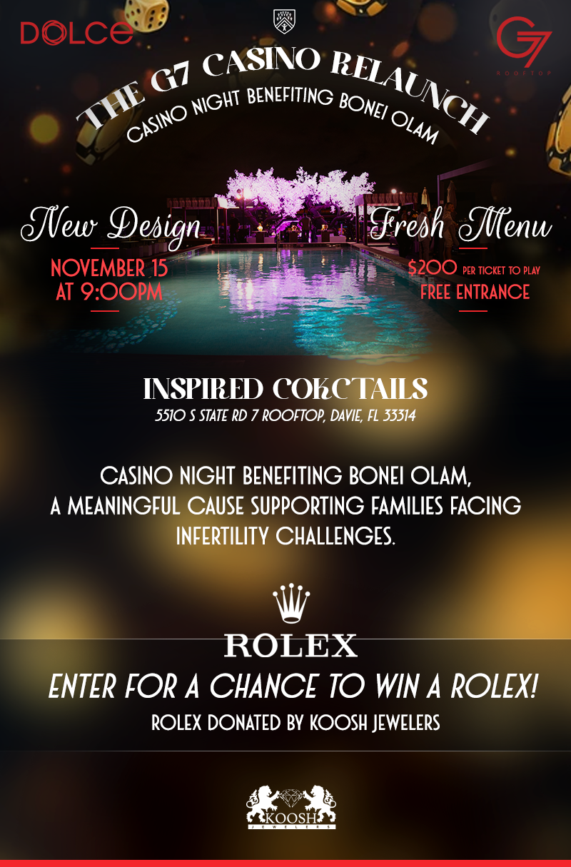 Every detail of G7 Rooftop has been reimagined to deliver a bold, fresh, and unforgettable atmosphere. Guests will indulge in a curated dining experience by Dolce, sip signature cocktails designed to captivate the senses, and enjoy casino-style entertainment under the stars – all in support of Bonei Olam, a global nonprofit dedicated to helping couples struggling with infertility realize their dream of building a family.