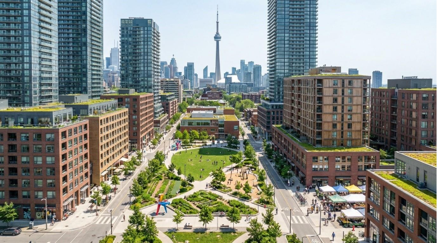A vibrant mixed-use, mixed-income neighbourhood in Toronto – the goal of well-designed inclusionary zoning policy.