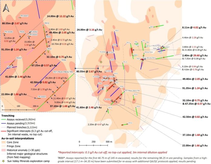 The structural orientations observed to date are consistent with the regional northeast-southwest fabric and the northwest-southeast to east-west structural corridors delineated by geophysical interpretations and field mapping. This alignment suggests a multi-phased structural framework that appears to have governed the localization and focusing of mineralizing fluids. While current trench intercepts are situated within the weathered regolith profile, where supergene processes influence grade distribution and values, the identification of primary sulphides at surface and within trenching profiles suggests proximity to an underlying source.