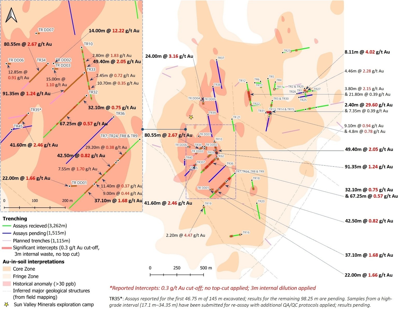 TR34: 80.55m @ 2.67 g/t Au; including 42.35m @ 4.25 g/t Au (ended in mineralization)