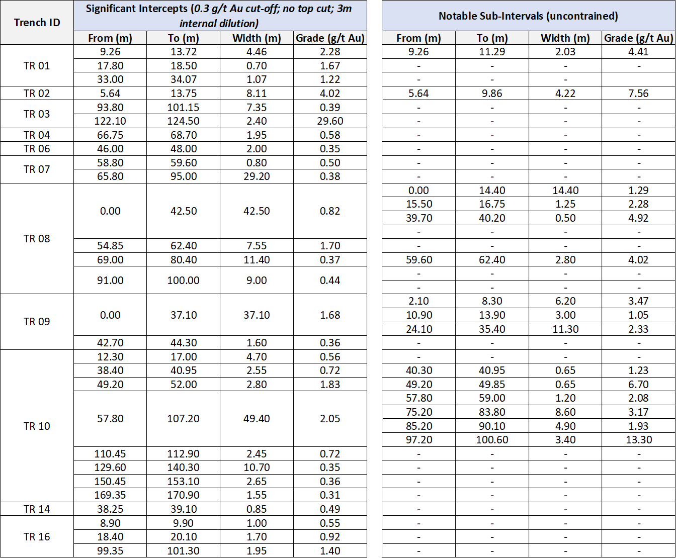 Refer to Appendix B for a summary of significant trench Intercepts (>1.0 g/t Au; 1.0m Internal Dilution) and internal high-grade over-limit sample distribution and gram meter values.