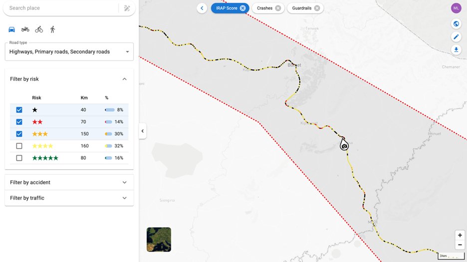 iRAP’s Star Rating methodology uses a predictive, risk-based approach to assess roads universally by reviewing attributes present along the road corridor. The time-consuming traditional method of conducting an iRAP Star Rating involves accredited coders manually reviewing video footage of road, 100m at a time, and coding more than 50 road attributes. These attributes are then processed through iRAP’s ViDA software to get an objective star rating measure of the level of safety for vehicle occupants, motorcyclists, cyclists, and pedestrians. To scale this process, iRAP launched AiRAP in 2019, which stands for the “accelerated and intelligent” capture of road safety data. Learn more about AiRAP at: www.irap.org/airap.
